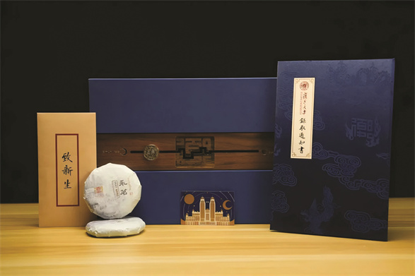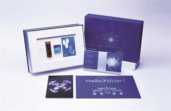 今年的灵感源于中国传统书匣,共分为两层,第一层是潞绸为封的录取通知书,第二层存着两枚茶砖、一封书信和一张沉金工艺NFC卡片,用带NFC功能的手机轻触可点亮光华楼上的星光。