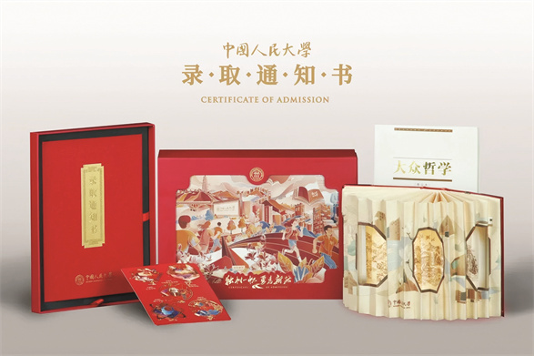 打开录取通知书,眼前流过一幅长长的画卷。礼盒内的书灯展开后是中国人民大学的前身陕北公学的青年奔赴延安的立体画面,随录取通知书附赠五大学科书签构筑“扎根中国,放眼世界”的学术高地。