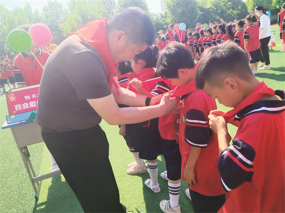 砀城第三小学教育集团党支部书记、校长高文举:亲爱的少先队员们,校长想送几句话给你们,愿你们成为有理想、有本领、有担当的新时代好少年!“德”字为先,希望你们心怀善良,做一个品德高尚的人;“智”者不惑,不断提升自己的智慧与学识,将来用所学为祖国的发展贡献力量;“体”魄强健,希望你们积极参加体育活动,培养坚韧的毅力;“美”能陶冶情操,你们要学会发现生活中的美;“劳”动最光荣,从劳动中体会付出的快乐,培养责任感与独立能力。