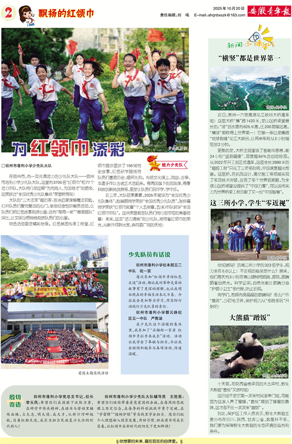 宿州市港利小学少先队大队辅导员 王胜男:希望你们继续带着爱党爱国的赤诚,在每周的思政课上坚定信念,在每季的科创挑战中勇于突破,在“学雷锋”“植树护绿”等实践里学会担当。愿你们把个人理想融入国家发展,用好习惯、好品质书写成长答卷,让红领巾在新时代的阳光下更加鲜艳!