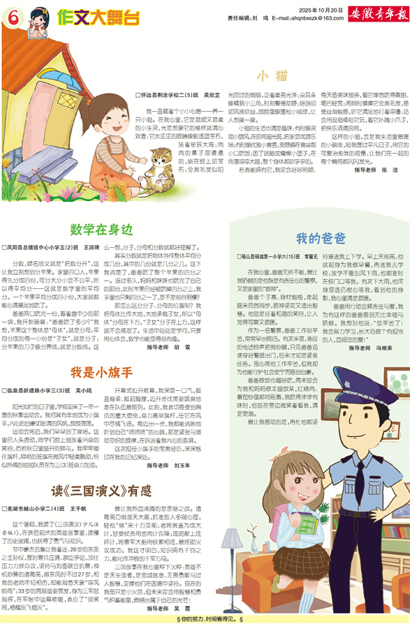 读《三国演义》有感 □芜湖市赭山小学二(4)班 王千帆 这个暑假,我读了《三国演义(少儿注音版)》,在跌宕起伏的英雄故事里,读懂了历史波澜,也获得了勇气与知识。 书中豪杰云集让我着迷:26岁的东吴之主孙权,面对曹兵压境、群臣争论,顶住压力力排众议,坚持与刘备联合抗曹;神机妙算的诸葛亮,借东风时不过27岁,和我的老师年纪相仿,却能洞悉天象“呼风唤雨”;33岁的周瑜雄姿英发,身为三军总指挥,在军帐中运筹帷幄,真应了“谈笑间,樯橹灰飞烟灭”。 最让我热血沸腾的是赤壁之战。诸葛亮巧借漫天大雾,抓准敌人多疑心理,轻松“借”来十万支箭;老将黄盖为成大计,甘受杖责用苦肉计诈降;庞统献上连环计,将曹军大船用铁索相连,最终助火攻成功。我这才明白,知识拥有千钧之力,能化作冲锋的千军万马。 三国故事在我心里种下火种:英雄不是天生强者,是忠诚信念、无畏勇敢与过人智慧,支撑他们在困境中坚持。现在的我虽只是小火苗,但未来定会用智慧和勇气积蓄能量,燃烧出属于自己的光芒! 指导老师 吴 霞