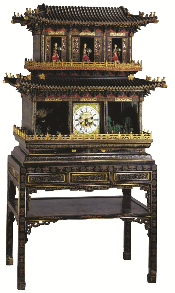 “黑漆彩绘楼阁群仙祝寿钟”可分为两层,上层是3间有报时机械人的小房屋,下层是用于计时的钟表,钟表两侧各有一个布景箱。每逢3、6、9、12点,机械人会走出房门报时,两个布景箱则会表演“海屋添筹”“群仙祝寿”的场景。