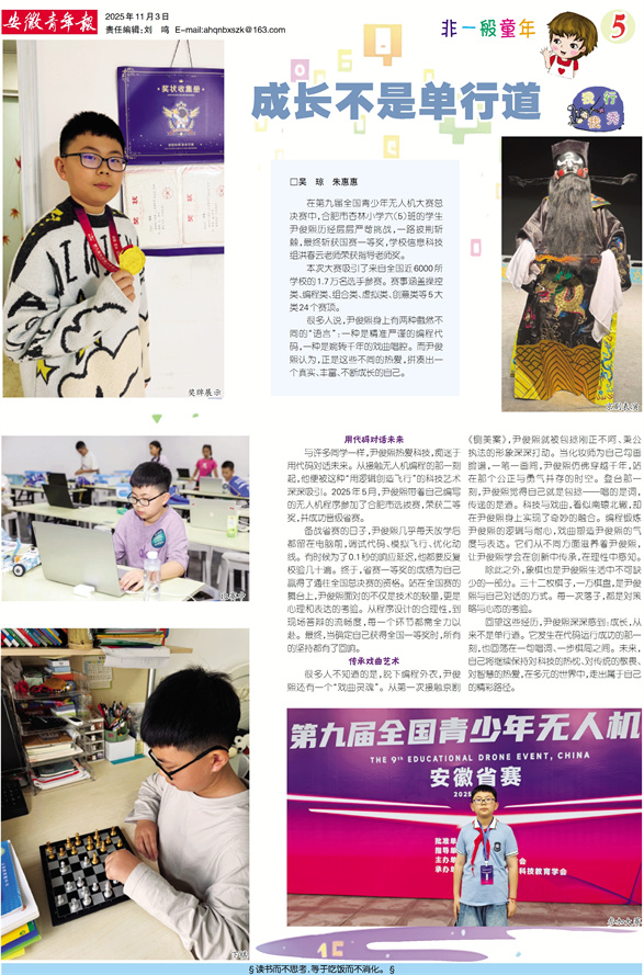 在第九届全国青少年无人机大赛总决赛中,合肥市杏林小学六(5)班的学生尹俊熙历经层层严苛挑战,一路披荆斩棘,最终斩获国赛一等奖,学校信息科技组洪春云老师荣获指导老师奖。