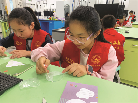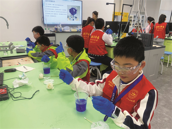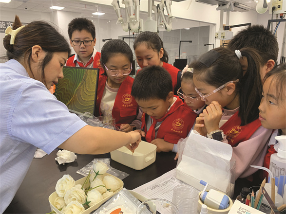 “太神奇了!每一片晶体都长得不一样!”学生记者贾祺安捧着自己的作品,对着灯光转动花茎,晶体折射出的光芒让她忍不住惊呼。“看到晶体一点点长出来,特别有成就感!我要把这朵‘宝石玫瑰’带回家,向爸爸妈妈展示我的科学成果!”学生记者王一琪爱不释手地捧着自己的作品说道。
