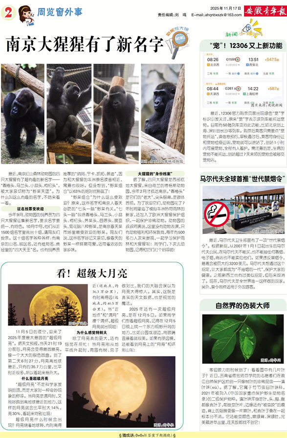科学放大镜 南京大猩猩有了新名字 最近,南京红山森林动物园的四只大猩猩有了超有趣的新名字——“香椿头、马兰头、小蒜头、枸杞头”,被大家亲切称为“野菜天团”。为什么叫这么有趣的名字,不妨来看一看。 征名投票受欢迎 今年9月,动物园的饲养员为四只大猩猩征集新名字,要求名字要统一、有特色。10月中旬,他们从近1500组名字里挑出十组,请网友们投票。这十组名字各种各样:有南京的山名、城区名,还有植物名、佛经里的“四大天王”名。也有饲养员推荐的“纳阔、宁卡、凯拓、慕迪”,因为和大猩猩的非洲原名读音相近,寓意也很好。但没想到,“野菜组合”以63%的绝对优势赢了! “野菜组合”为什么这么受欢迎?原来,这些名字和南京人春天必吃的“七头一脑”野菜有关。“七头一脑”包括香椿头、马兰头、小蒜头、枸杞头、荠菜头、苜蓿头、豌豆头、菊花脑八种野菜,是南京春天菜市场里最受欢迎的野菜。网友们说,这些名字好记又亲切,像春天的野菜一样鲜嫩可爱,还带着浓浓的家乡味。 大猩猩的“身份档案” 据了解,四只大猩猩是西部低地大猩猩,来自荷兰的博格斯动物园,今年2月才抵达南京。“香椿头”是它们的“老大”,尖头银背,是群体首领。为了欢迎它们,动物园花了7年时间建造了模拟非洲热带雨林的新家,还加入了欧洲大猩猩保护组织,一起保护珍稀动物。动物园的叔叔阿姨说,这里没有动物表演,只有动物福利和环保教育,每年有500多万人次来参观,一起学习保护雨林和大猩猩呢!同学们,下次去动物园,记得和它们打个招呼哟!
