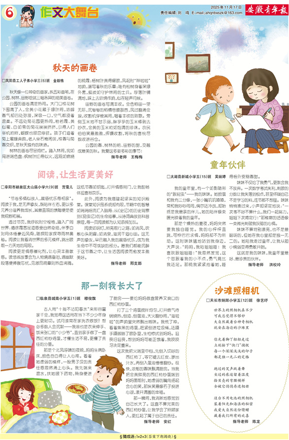 秋天的画卷 □凤阳县工人子弟小学三(5)班 金毅格 秋天像一位神奇的画家,执五彩画笔,在公园、树林、田野绘就三幅各异的绝美画卷。 公园的画卷满是热闹。大门口桂花树下围满了人,金黄小花藏于绿叶间,浓醇香气却四处弥漫,深吸一口,空气都浸着温柔。不远处菊花园更热闹,粉若霞、黄似蜜、白如雪的菊花挨挨挤挤,引得人们举机拍照,蝴蝶也留恋停驻。孩子们追着菊上蜜蜂奔跑,老人坐石椅闲谈,桂香与菊香交织,是秋天独有的味道。 树林的画卷尽显绚烂。踏入林间,宛如闯进调色盘:枫树叶红得似火,远观如燃烧的晚霞;杨树叶黄得耀眼,风起时“哗啦啦”地响,谱写着秋的乐章;唯有松树身着深绿外套,挺拔如守护林间的士兵。厚落叶铺满地,踩上去软绵作响,似在轻声问候。 田野的画卷写满丰收。金色稻田一望无际,沉甸甸的稻穗弯腰颔首,风过翻涌金浪,收割机穿梭其间,唱着丰收的欢歌。旁侧玉米地不甘示弱,胖乎乎的玉米棒剥去纱衣,金黄的玉米粒如饱满的珍珠。农民伯伯笑意盈盈,挥镰收割,将秋的喜悦尽数收进谷仓。 公园的香、树林的艳、田野的甜,交融成最美的秋。我爱这多姿多彩的季节! 指导老师 王梅梅