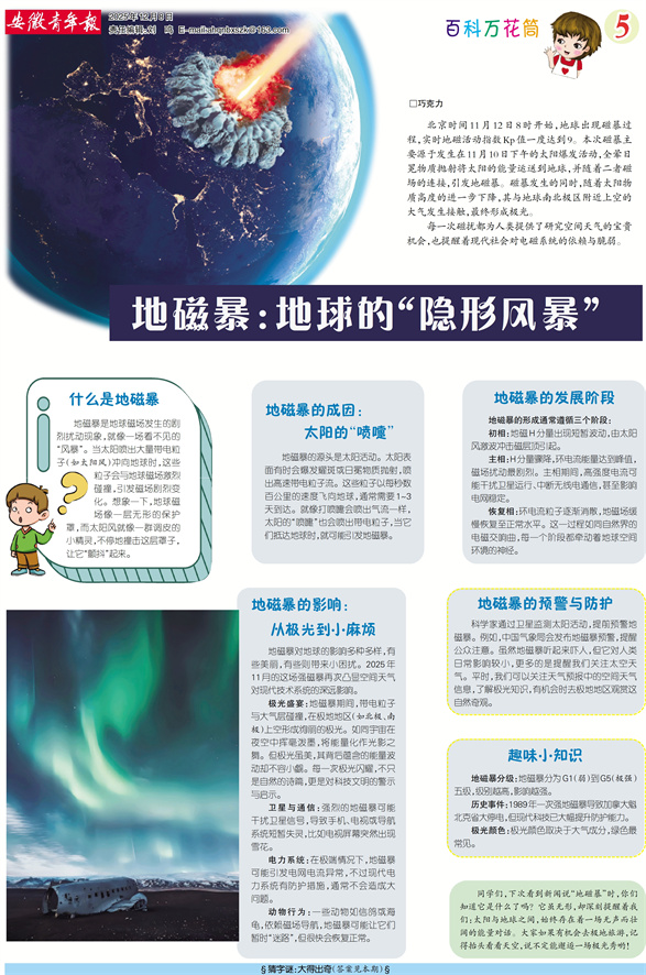 同学们,下次看到新闻说“地磁暴”时,你们知道它是什么了吗?它虽无形,却深刻提醒着我们:太阳与地球之间,始终存在着一场无声而壮阔的能量对话。大家如果有机会去极地旅游,记得抬头看看天空,说不定能邂逅一场极光秀哟!